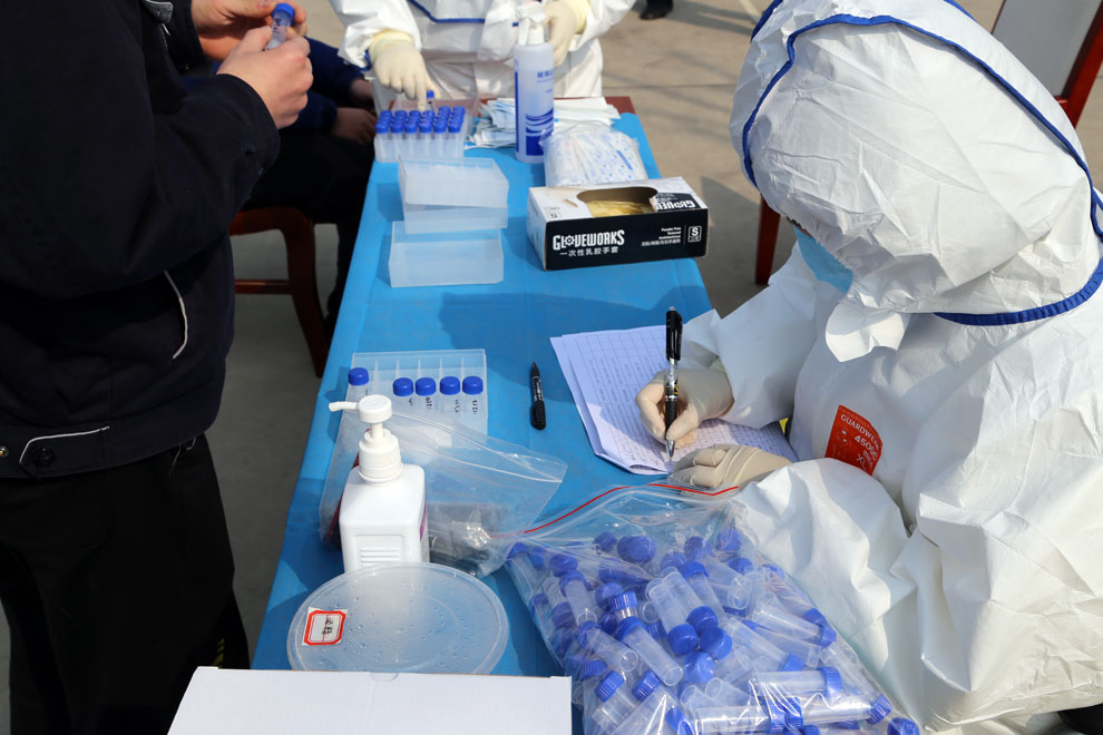 上午11點,中航電測西安中心園區(qū)第二批入園員工在綜合管理部的組織下,陸續(xù)來到南區(qū)廣場,所有員工均佩戴防護(hù)口罩,按照已定順序分散站隊,依次領(lǐng)取標(biāo)記順序的細(xì)胞保存液,由醫(yī)務(wù)人員依次采集“咽拭子”細(xì)胞標(biāo)本。醫(yī)務(wù)人員再將采集好的“咽拭子”細(xì)胞標(biāo)本統(tǒng)一運(yùn)送至實驗室進(jìn)行檢測,統(tǒng)一出檢測結(jié)果。